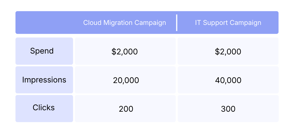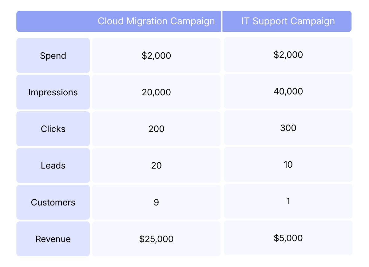 Based on this data alone, it might seem like your IT Support campaign is doing much better than your Cloud Migration campaign. As a result, you might be inclined to invest more in that campaign.