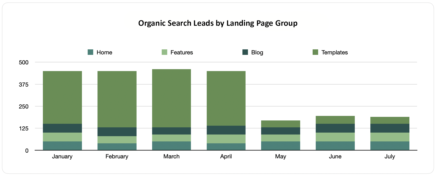 Next, we filtered our website leads to only include those from Organic Search and broke them down by landing page group. That’s when we spotted the key insight: we’d lost a significant number of leads that used to come through our free template library — a collection of downloadable document templates.