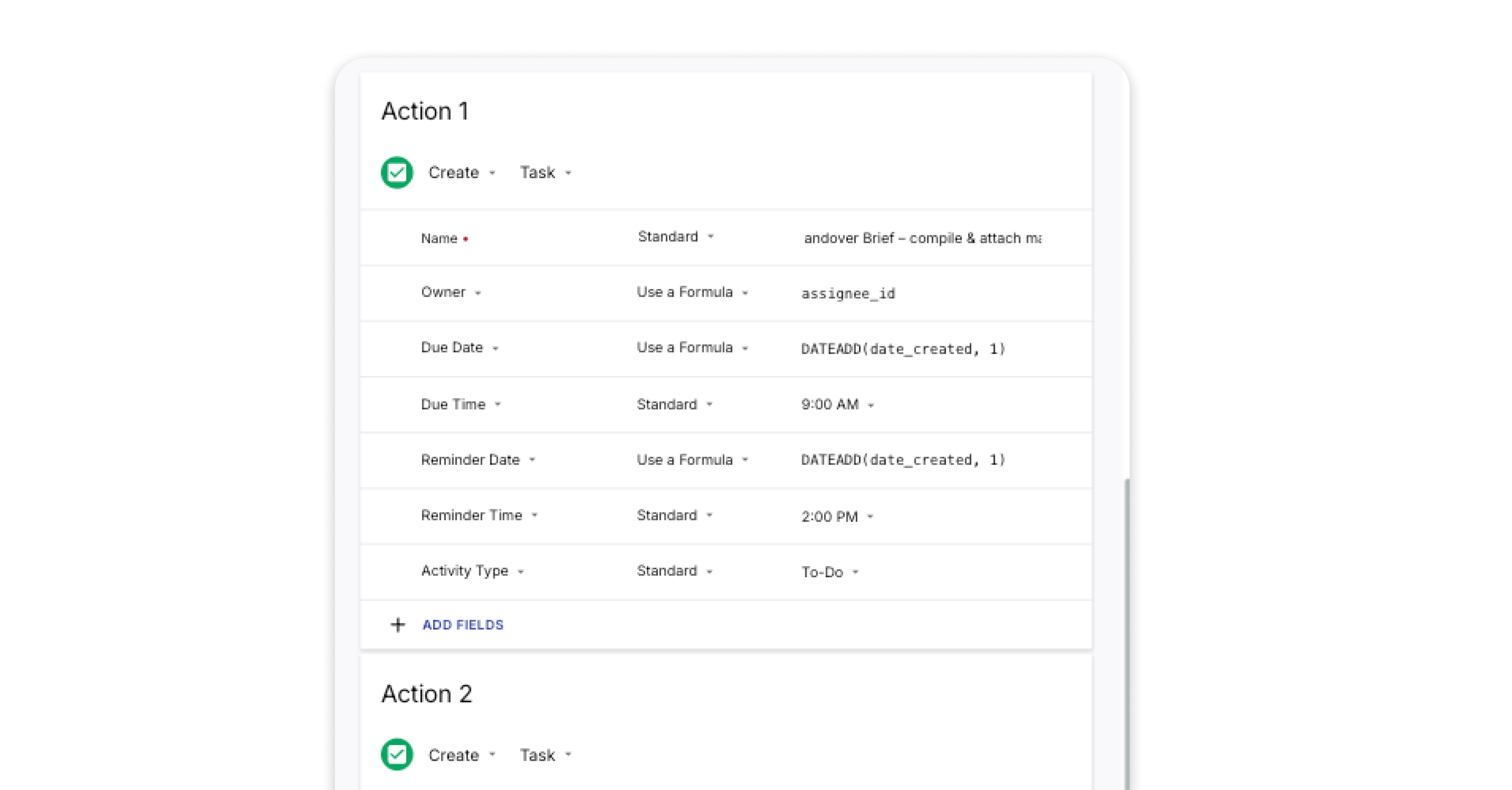 Owner: Select the dropdown where it says “Standard” and select “Use a Formula” → assignee_id (this will assign the task to whoever closed the deal)